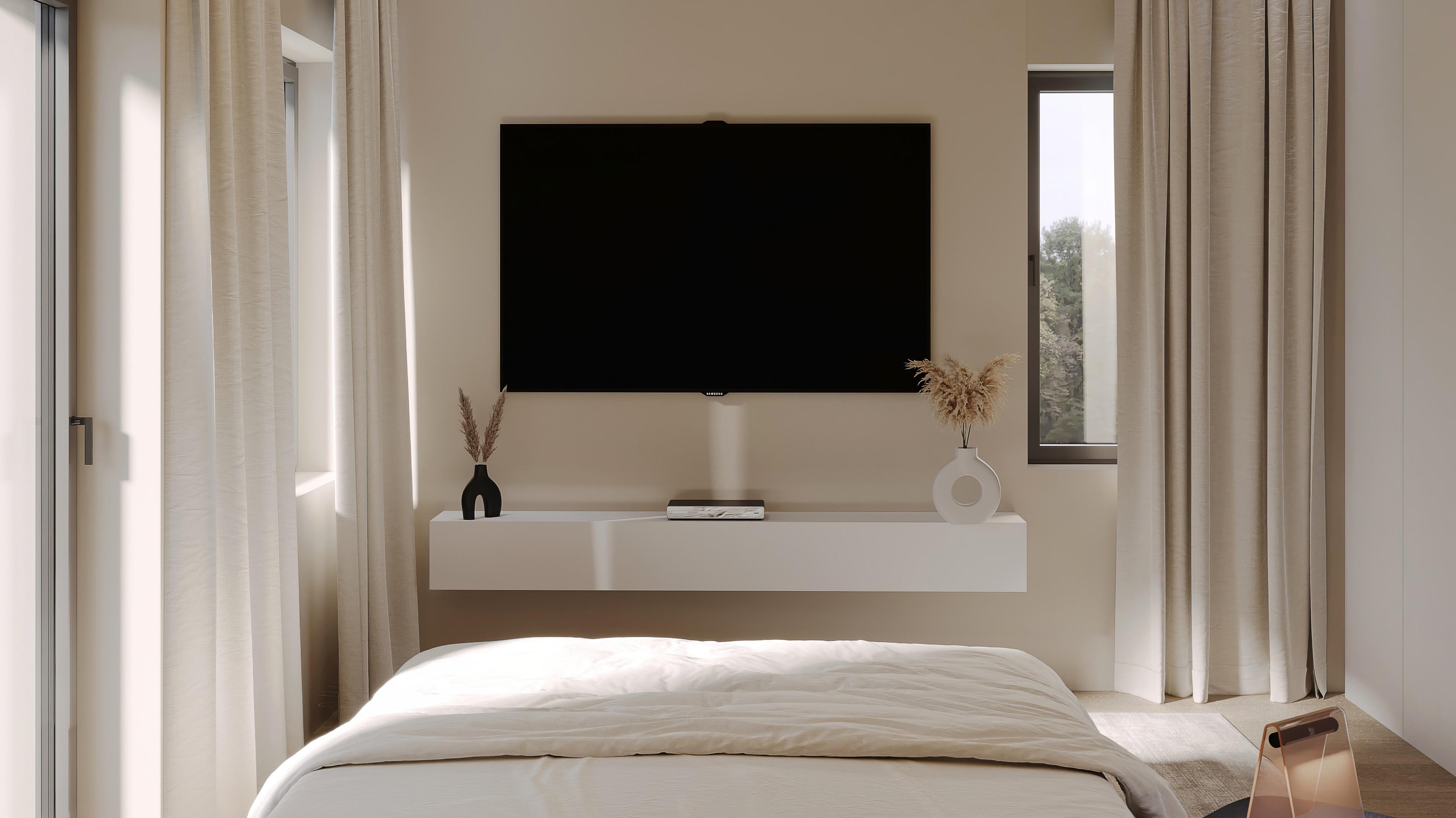 Wnętrze emanuje spokojem i harmonią, zapraszając do wytchnienia po intensywnym dniu. Dominująca kolorystyka w odcieniach stonowanej bieli tworzy atmosferę jasności i lekkości, podkreślając przestrzeń. Wygodne łóżko z miękkimi poduszkami zachęca do odpoczynku, a obok niego elegancka szafa zapewniająca mnóstwo miejsca na przechowywanie ważnych dla Ciebie rzeczy.